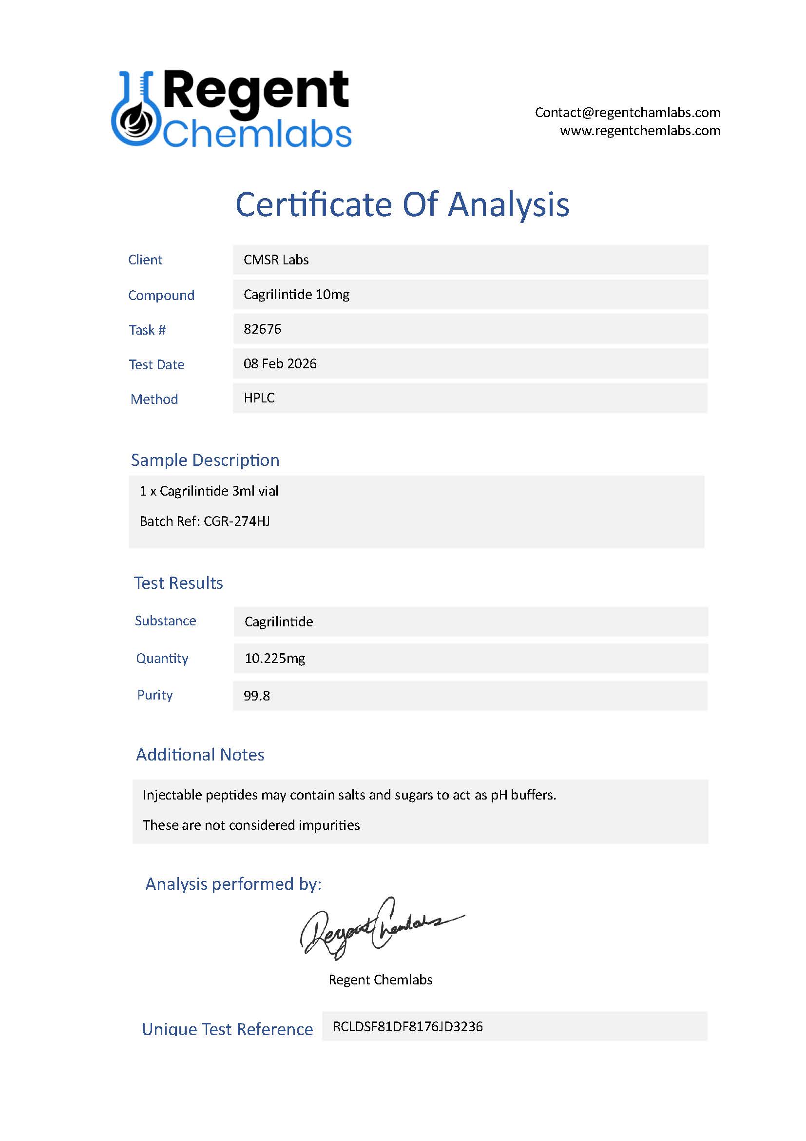 CMSR Labs offers Cagrilintide strictly for research and laboratory use. It is not intended for human consumption, medical treatment, or diagnostic use. All products are manufactured in compliance with legal and ethical standards to support the research community.